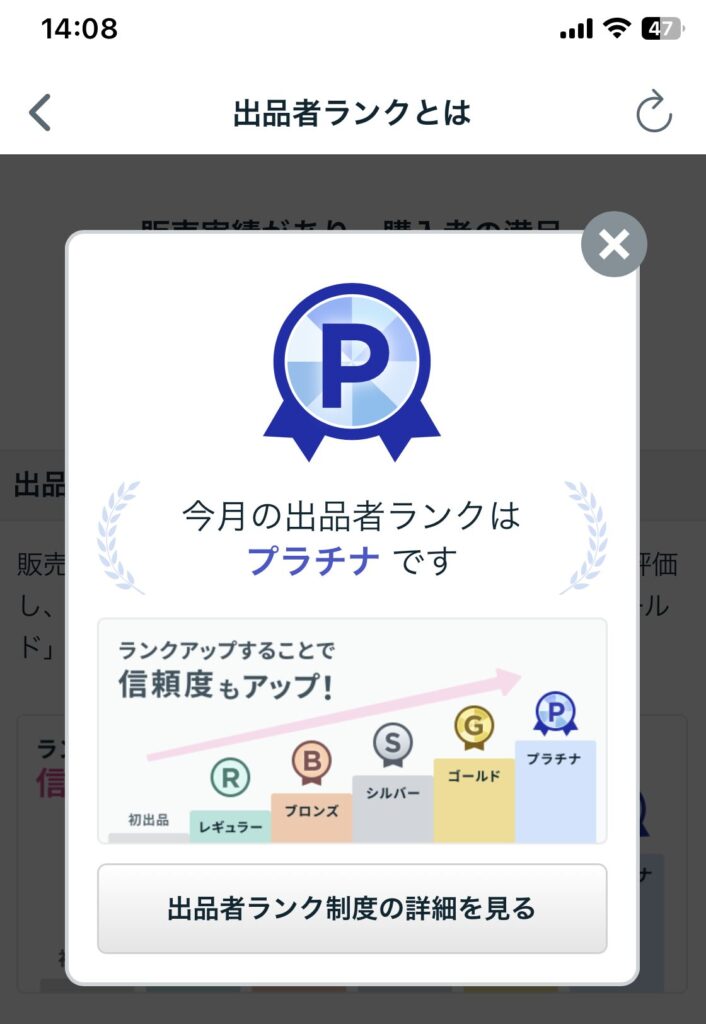 プラチナランクは、上位1%未満の出品者しか獲得できないランクです。